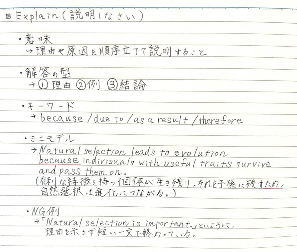 - Explain(説明しなさい):理由や原因を詳しく述べる(AO2)